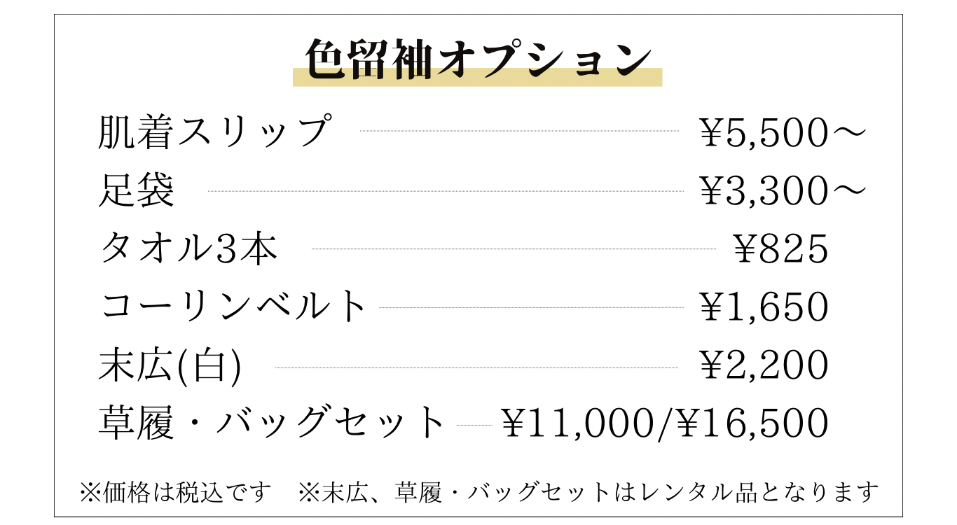 ご来店時、ご自身の肌着類をお持ちになられた方はその場でお預かりし、衣裳と一緒にお届けいたします。