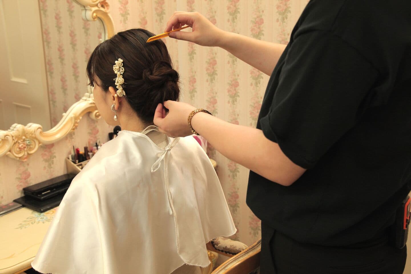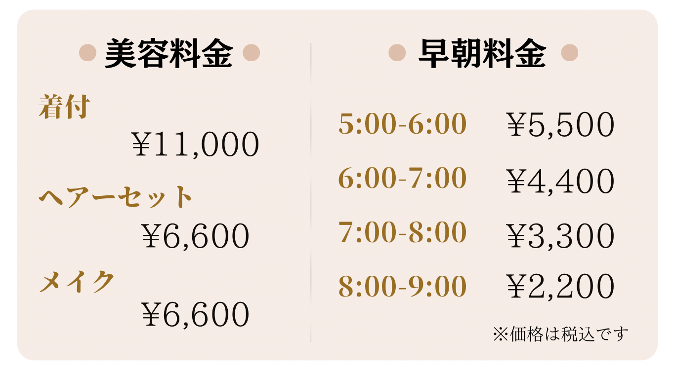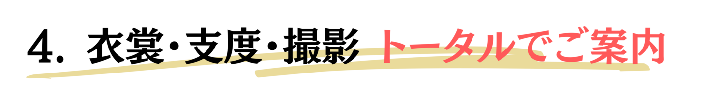 奥様はご予約された美容室へ衣裳と着付・ヘアーセット・メイクなどのお時間のご確認をお願いいたします。