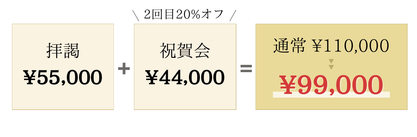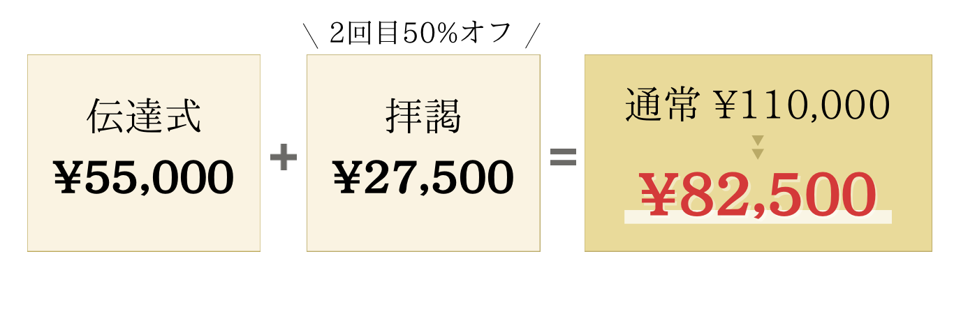 伝達式と拝謁時で同じ衣裳を2回ご使用される方は、2回目の衣裳代金が50%オフとなります。