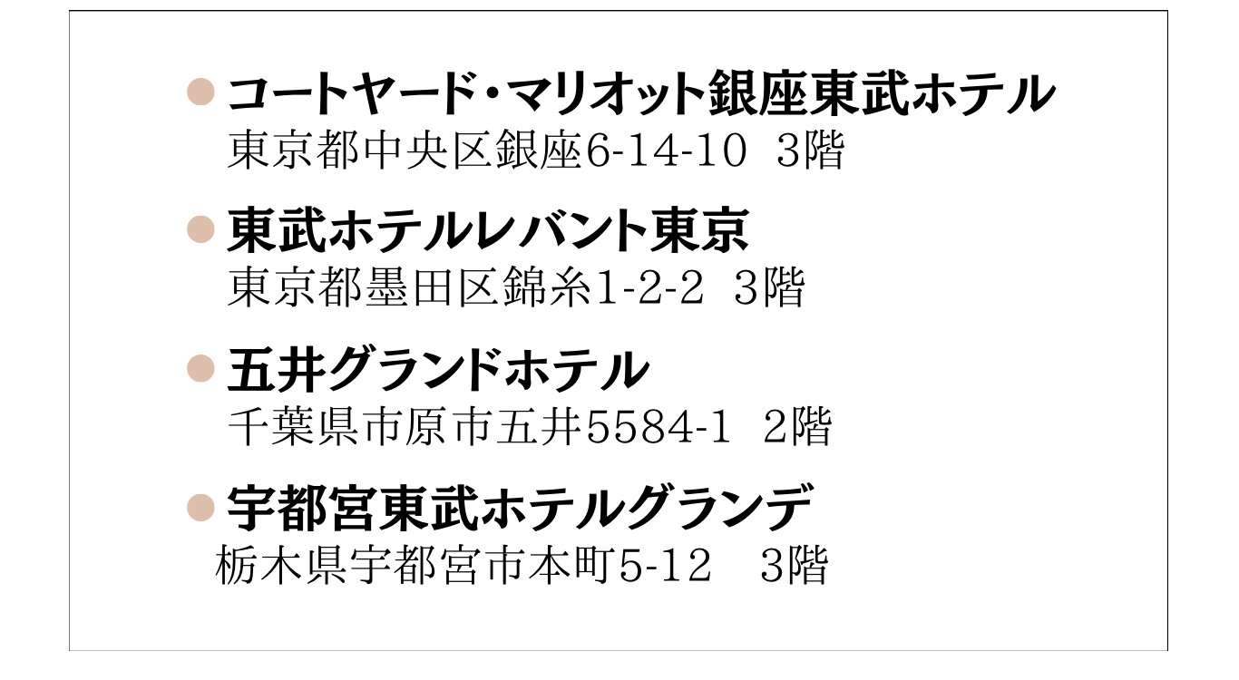 アンジェリーク大宮のほかに、コートヤード・マリオット銀座東武ホテル、東武レバント東京、五井グランドホテル、宇都宮東武ホテルグランデでの衣裳合わせも承っております。